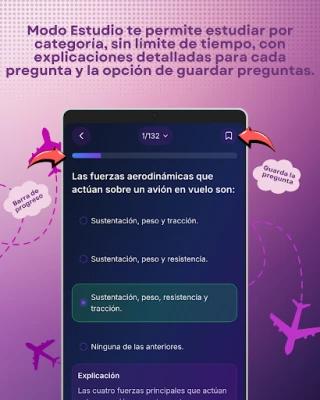 • Modo Examen: Simula un examen real de la DGAC, eligiendo categorías, tiempo y número de preguntas.